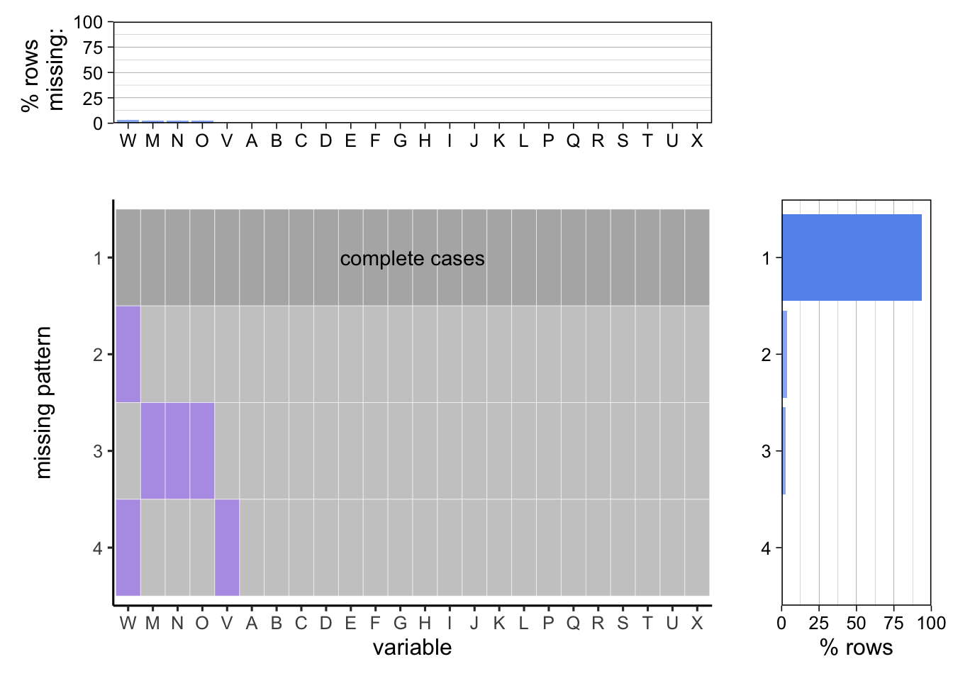 library(redav)drink =read.csv('500_Cities__Binge_drinking_among_adults_aged___18_years.csv')#renaming columns to Lettersdrink_rename <- drink |>rename('A'=Year,'B'=StateAbbr,'C'=StateDesc,'D'=CityName,'E'=GeographicLevel,'F'=DataSource,'G'=Category,'H'=UniqueID,'I'=Measure,'J'=Data_Value_Unit,'K'=DataValueTypeID,'L'=Data_Value_Type,'M'=Data_Value,'N'=Low_Confidence_Limit,'O'=High_Confidence_Limit,'P'=Data_Value_Footnote_Symbol,'Q'=Data_Value_Footnote,'R'=PopulationCount,'S'=GeoLocation,'T'=CategoryID,'U'=MeasureId,'V'=CityFIPS,'W'=TractFIPS,'X'=Short_Question_Text)plot_missing(drink_rename)