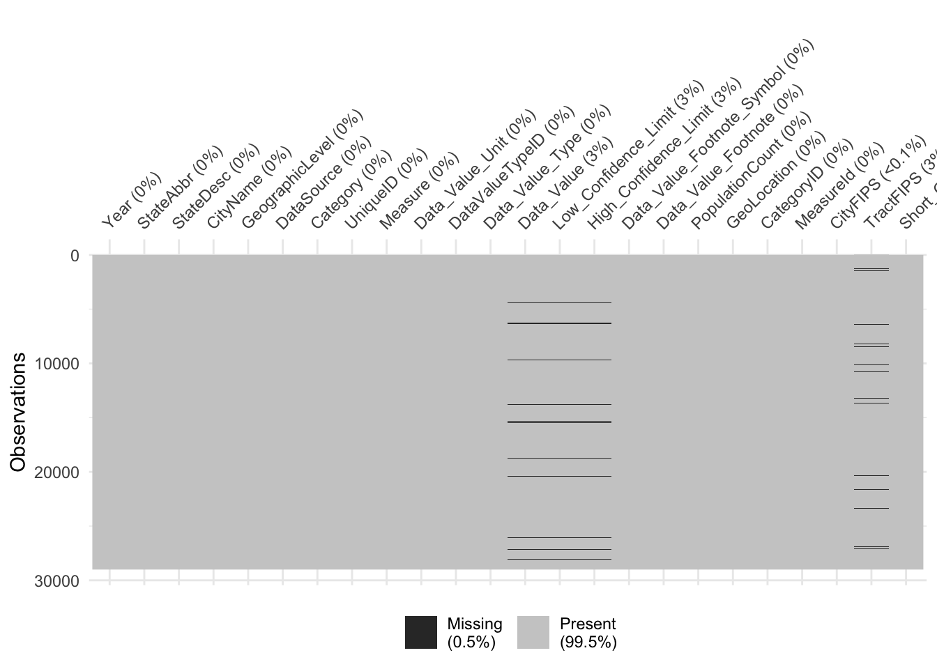 Missing values exist in the data set and are in 3 main patterns. Tract FIPS and City FIPS are missing together in rare occasions and Tract FIPS is missing in a small percent of rows. Data value and their respective confidicent intervals are missing together.