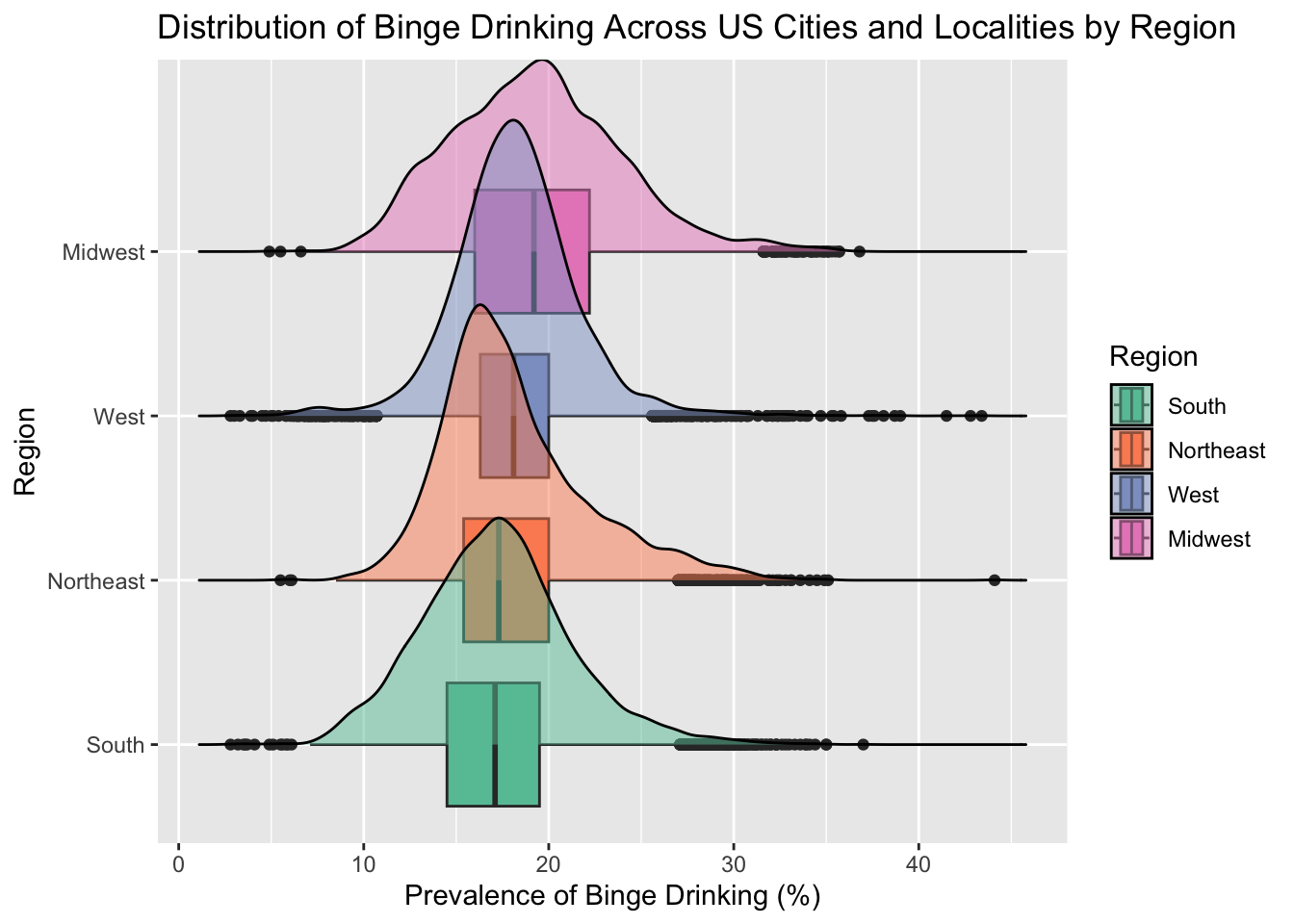 # allggplot(combined, aes(x=BingeDrinkingPrv, y=Region, fill=Region))+geom_boxplot()+geom_density_ridges(alpha =0.5) +scale_fill_brewer(palette="Set2") +labs(title ="Distribution of Binge Drinking Across US Cities and Localities by Region",x="Prevalence of Binge Drinking (%)")