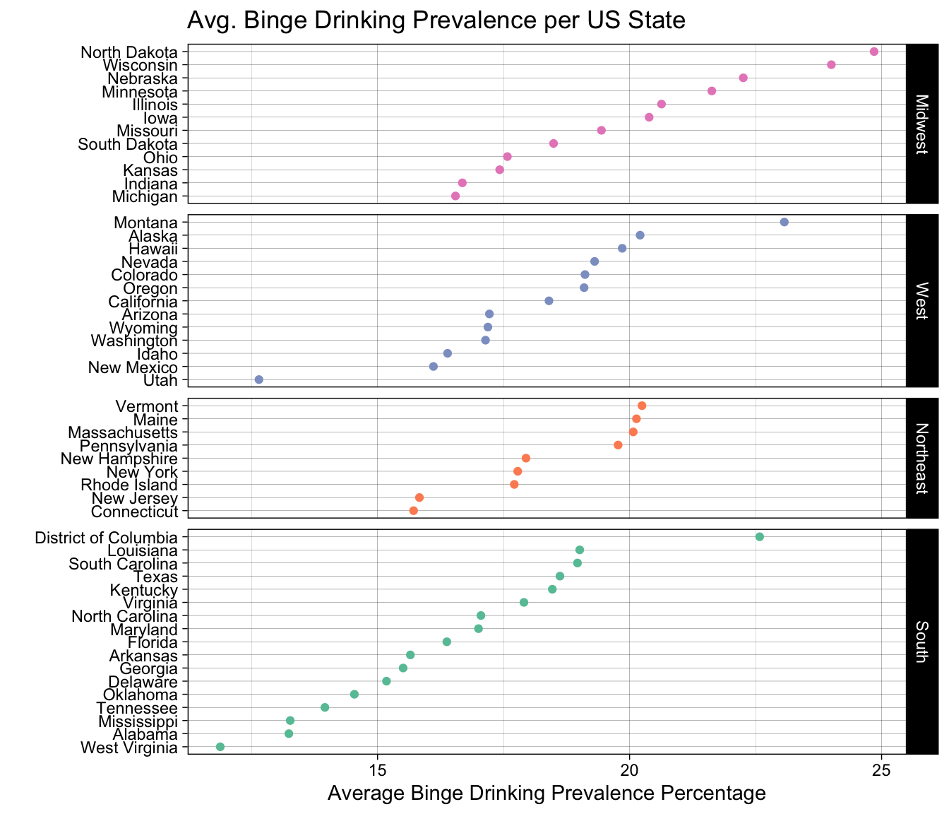 Here we show a Cleveland Dot Plot faceted by region. Looking at each individual graph shows us ranking of binge drinking prevalence across the states. Looking across graphs, we can see a slight ordering that goes south- northeast- west- midwest. We can also see some outliers in the data such as Utah, which makes sense since there exists a large population of mormons in the area and they dont not drink alcohol as part of their religion.