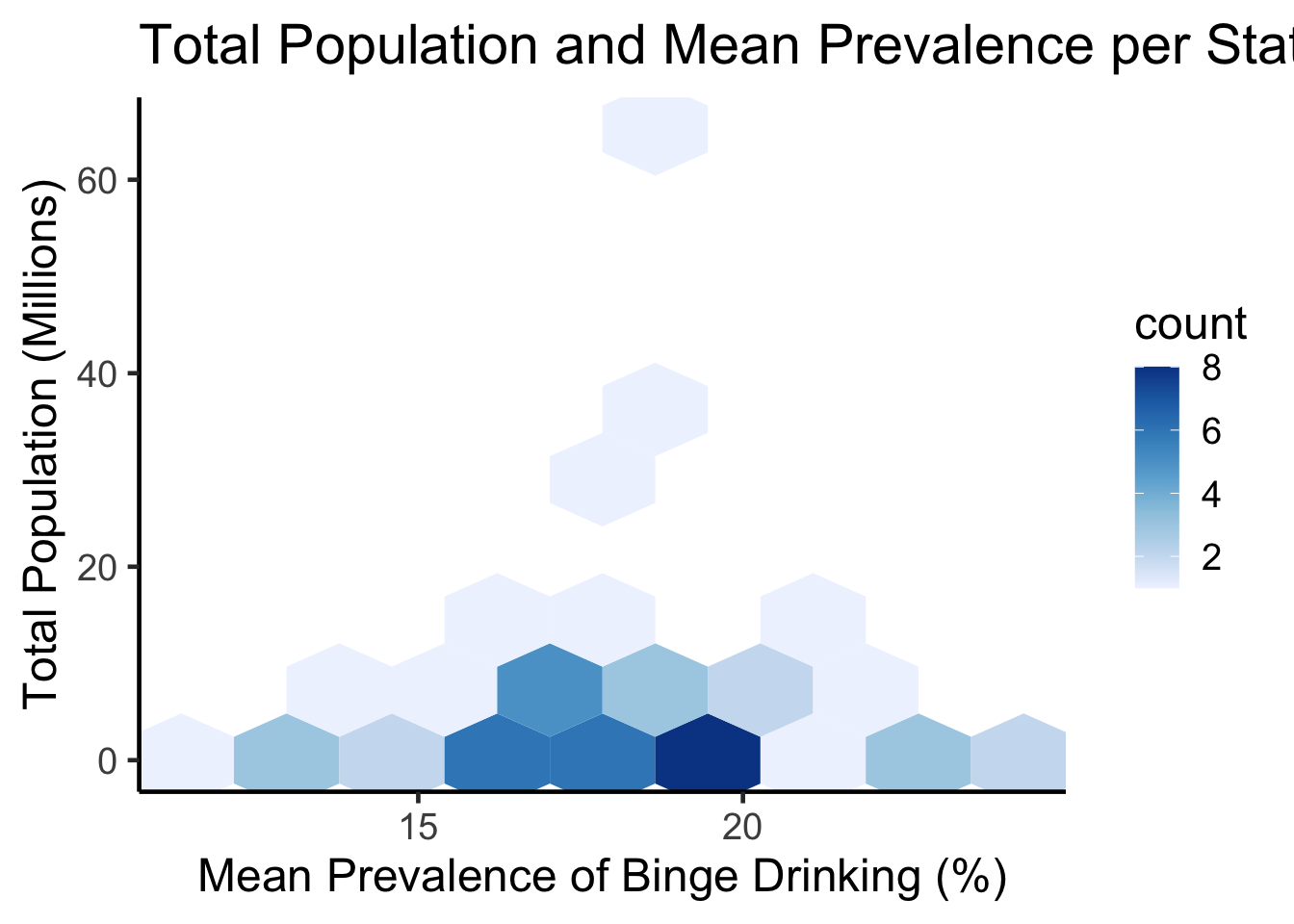 ggplot(states, aes(meanPrv, total_pop)) +geom_hex(bins=8) +scale_fill_distiller(palette ="Blues", direction=1) +theme_classic(18) +ggtitle("Total Population and Mean Prevalence per State") +labs(x="Mean Prevalence of Binge Drinking (%)",y="Total Population (Millions)")