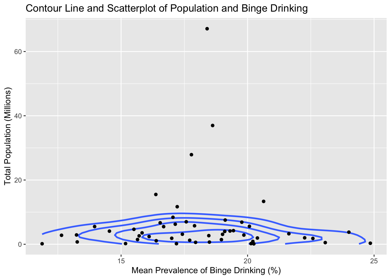 ggplot(states, aes(meanPrv, total_pop)) +geom_density_2d(bins=5, linewidth=1, color="royalblue1") +geom_point() +ggtitle("Contour Line and Scatterplot of Population and Binge Drinking") +labs(x="Mean Prevalence of Binge Drinking (%)",y="Total Population (Millions)")