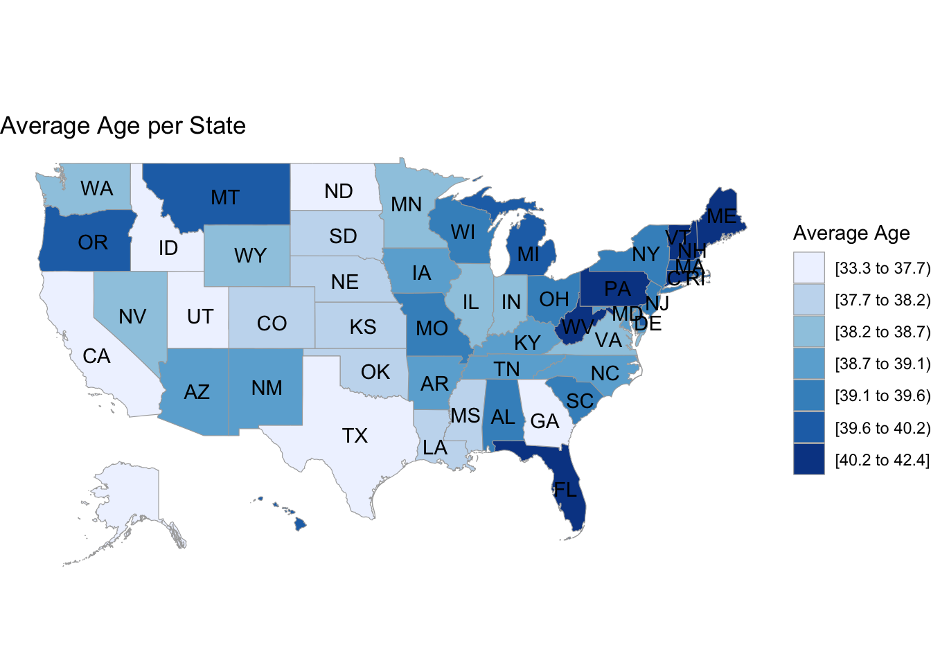 # age choroplethdf_chlor2 <- states|>select(-Region)|>transmute(region =tolower(`State`), value = avg_age)state_choropleth(df_chlor2,title ="Average Age per State",legend ="Average Age")