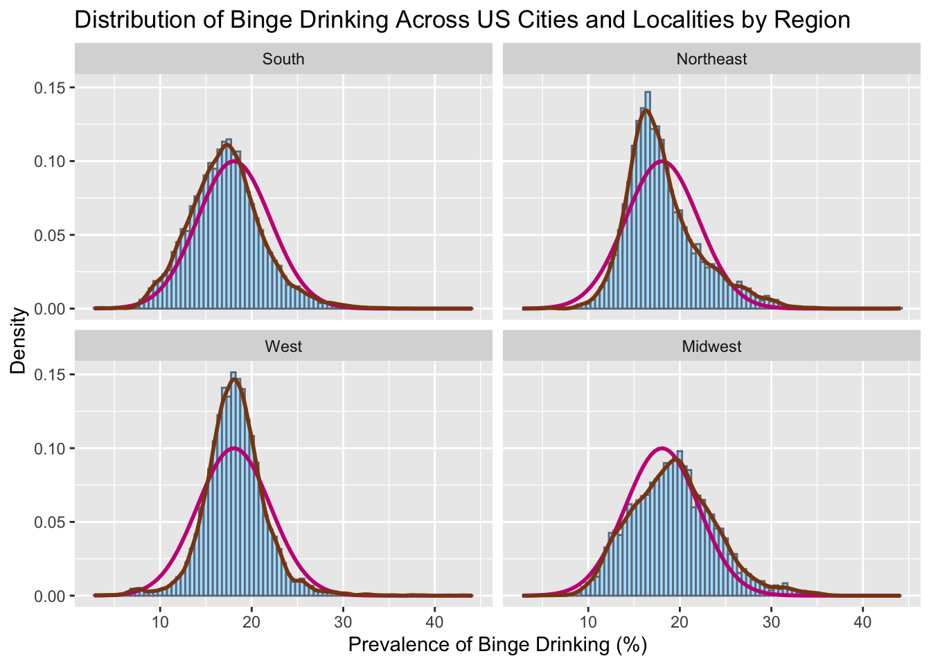 # all facetedggplot(combined, aes(x = BingeDrinkingPrv)) +geom_histogram(aes(y =after_stat(density)), color ="lightsteelblue4",fill ="lightskyblue1", binwidth =0.5) +geom_function(fun = dnorm, col ="mediumvioletred",args =list(mean(combined$BingeDrinkingPrv), sd(combined$BingeDrinkingPrv)),lwd =1) +geom_density(col="saddlebrown", lwd =1)+labs(title ="Distribution of Binge Drinking Across US Cities and Localities by Region", x="Prevalence of Binge Drinking (%)",y="Density") +facet_wrap(vars(Region))